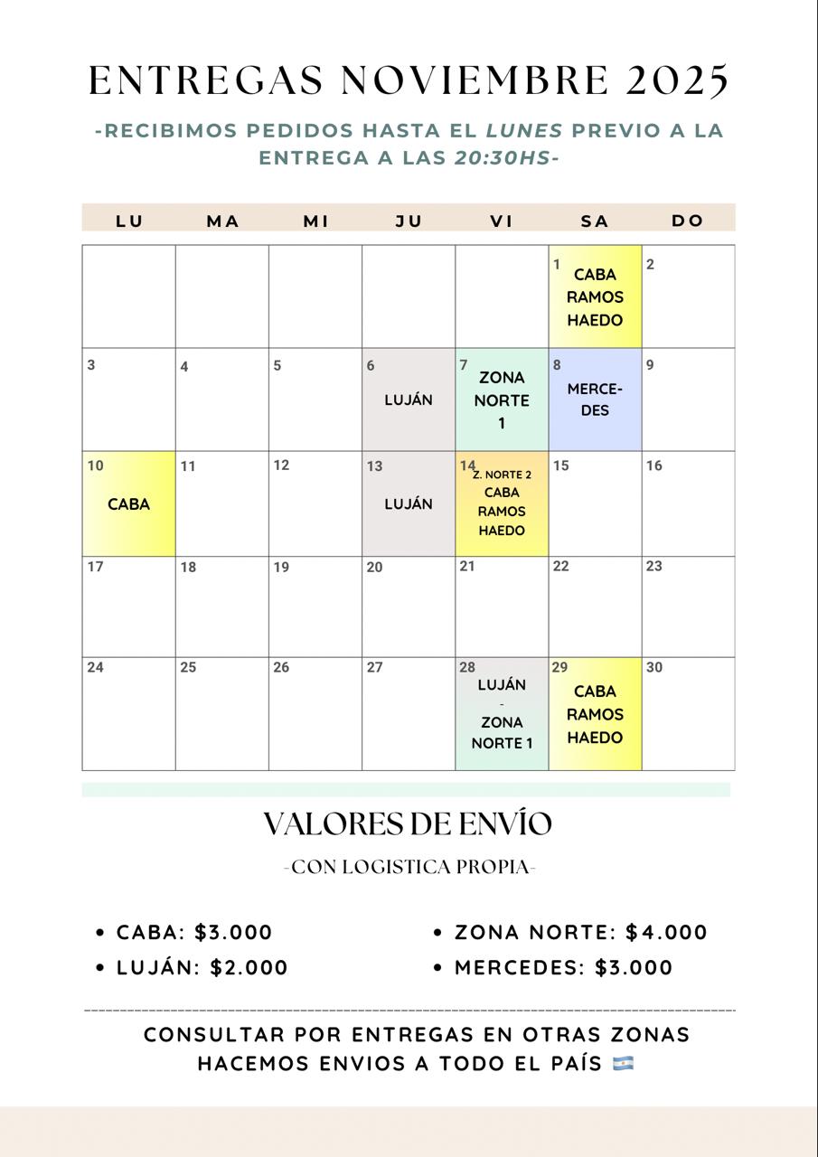 Info de Entregas x Zona Ir a la Tienda Online Fechas de Entrega x Zona Oct-2025Fechas de Entrega x Zona Nov-2025TODO AMBA - Entregas Miércoles de 15 a 21hsHorarios CABAHorarios Zona Norte 1Horarios Zona Norte 2 Finalizar Compra