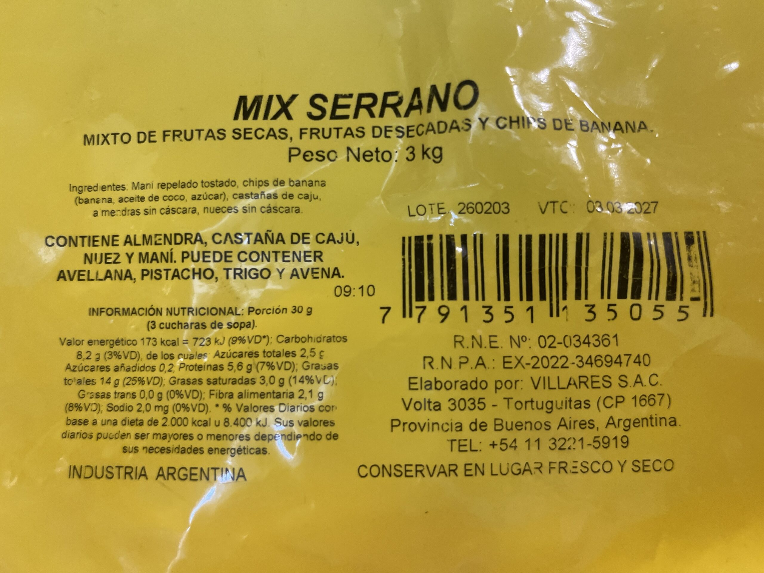Ingredientes: Nueces, almendras, castañas de caju tostada , mani y banana chips.