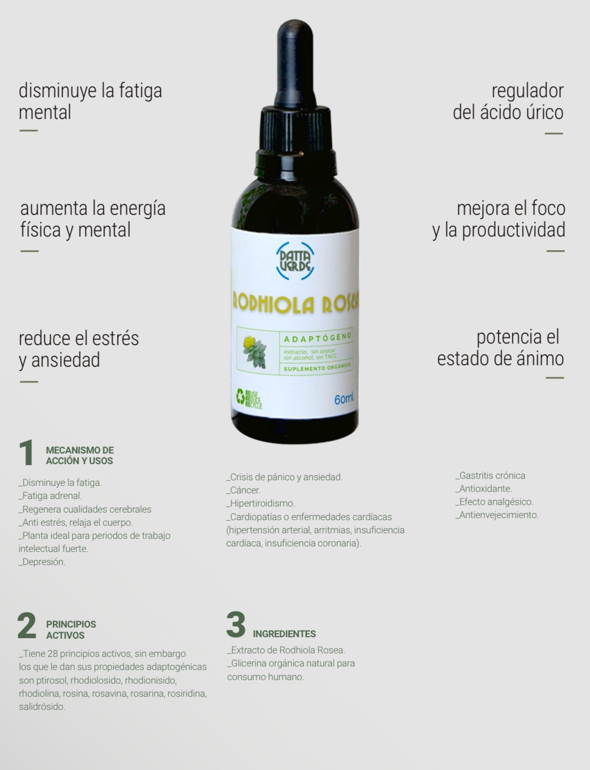 Ingredientes: rhodiola rosea y glicerina orgánica natural de consumo humano.